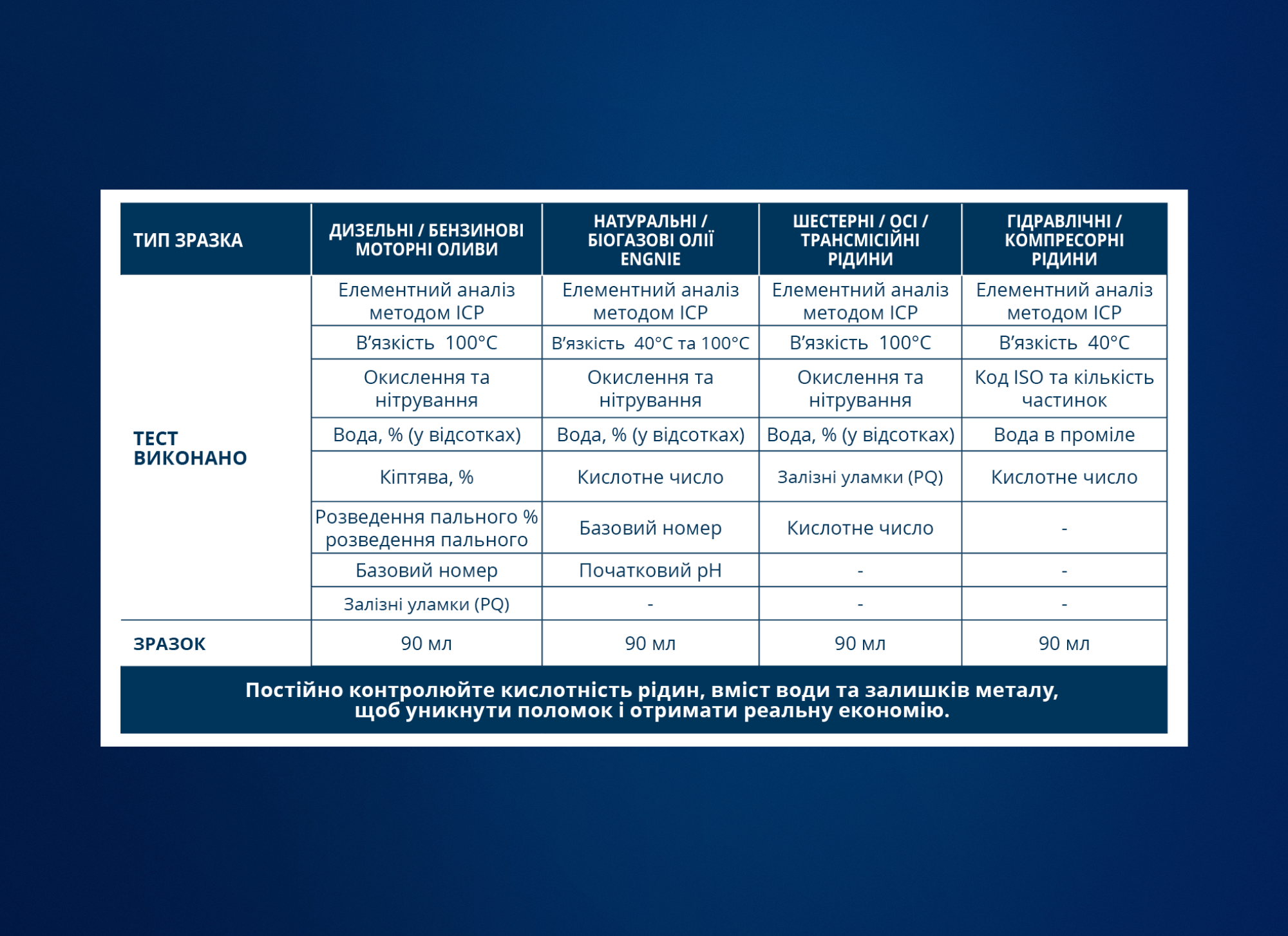 - Ми розробили цю послугу, щоб запропонувати різні рівні аналізу, і вона може бути адаптована до вимог замовника. Незалежно від того, чи працюєте ви в суворих умовах або використовуєте особливо складне обладнання, ми можемо проаналізувати вашу оливу і дати ґрунтовні рекомендації з технічного обслуговування.